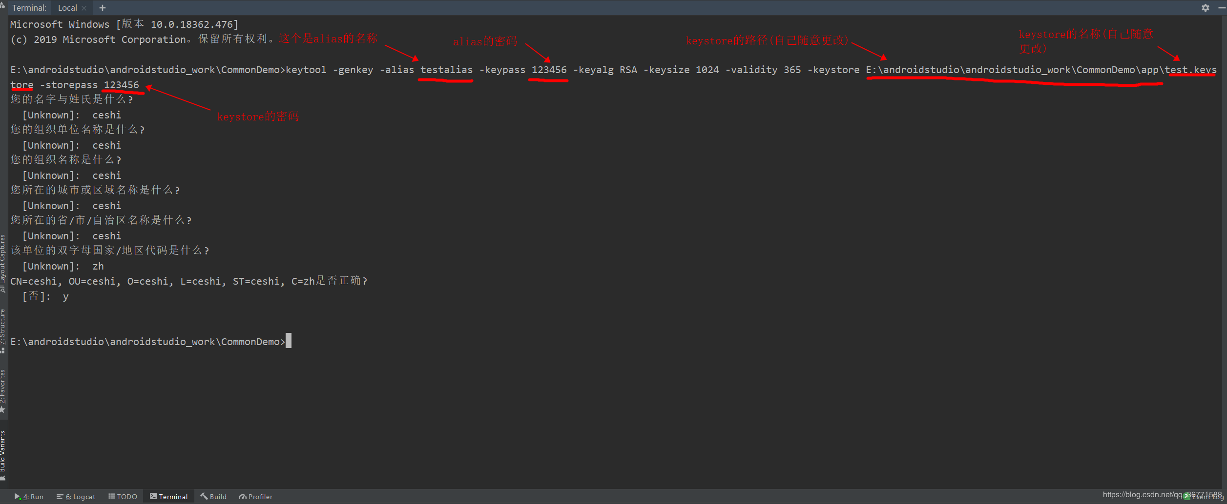 点击确定之后会出现让你输入详细信息的,可以直接回车,最后确定时输入y, keypass和storepass两个密码需要一致,不然打包会有问题2