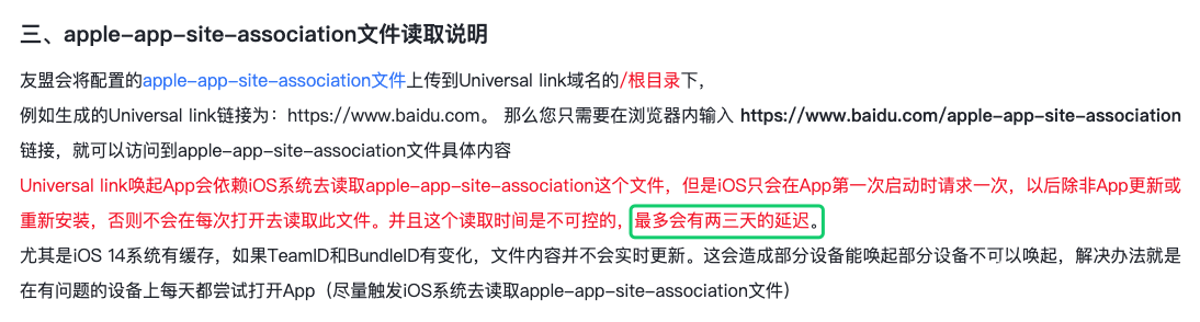 apple-app-site-association的更新不会让 iOS 本地的apple-app-site-association同步更新,即 iOS 一般只会在 APP 下载完后初次启动才会下载这个文件,所以如果修改了apple-app-site-association文件,请删除 APP 后重新下载.