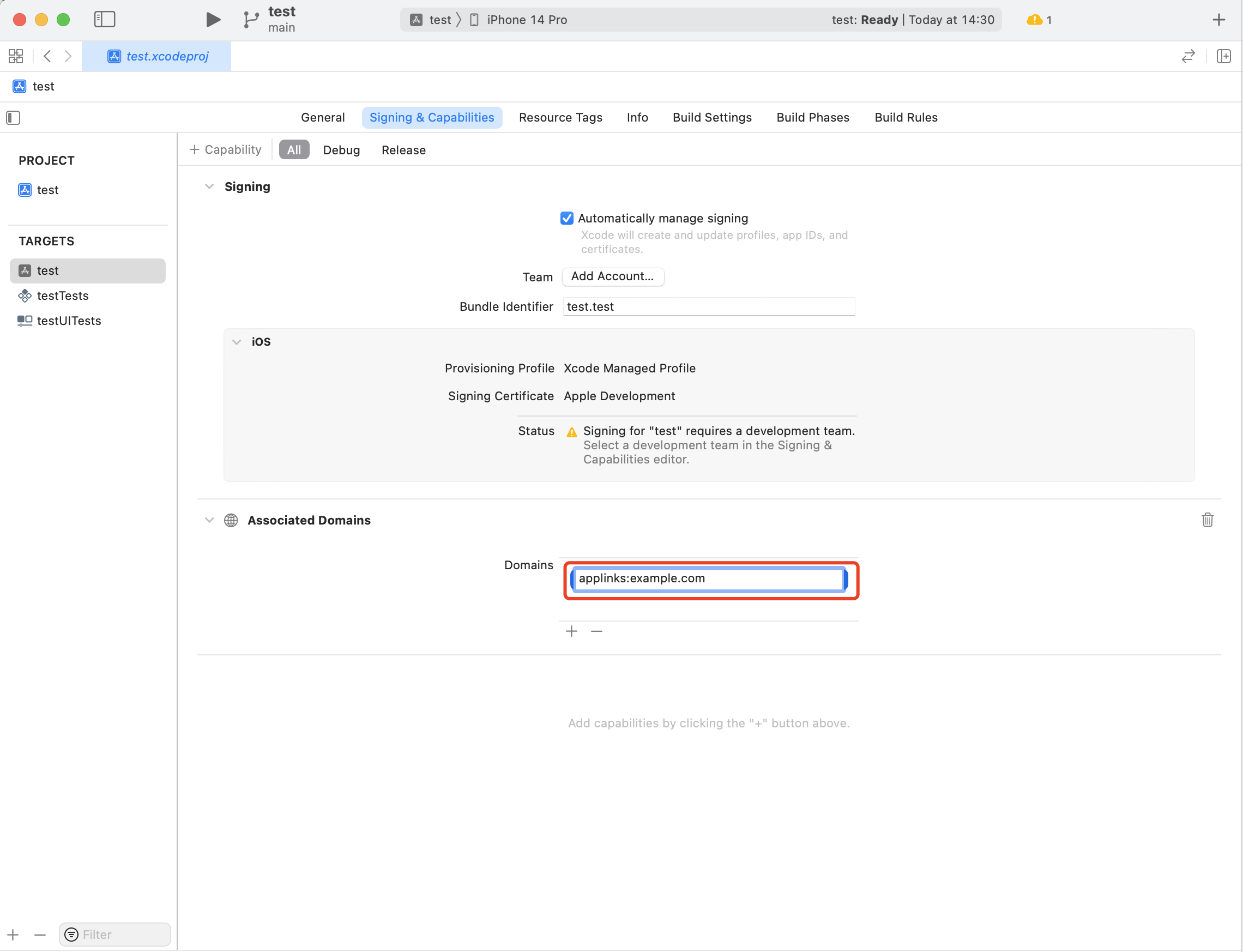 Associated Domains里面配置的Universal Links,必须以applinks:为前缀,格式为:applinks:+配置的域名,例如:applinks:test.com