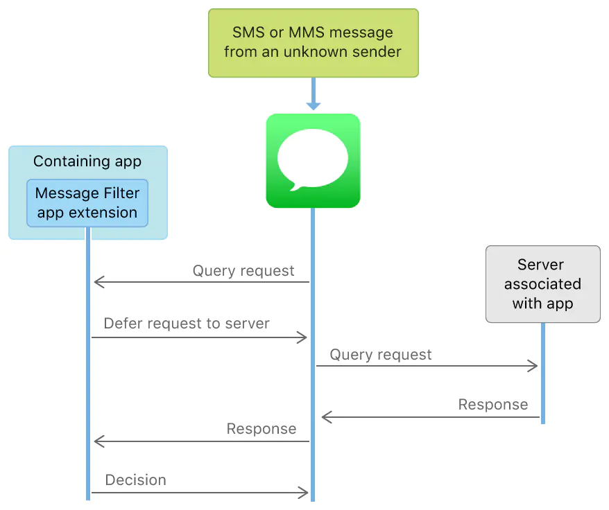 当用户收到来自未知发件人的SMS或MMS消息时,Messages App可以要求您的Message Filter Extension应用程序扩展来确定该消息是主动还是不需要的。 您的应用扩展程序可以通过使用自己的内置数据和逻辑,或者推迟到您的关联服务器完成的分析来做出决定。