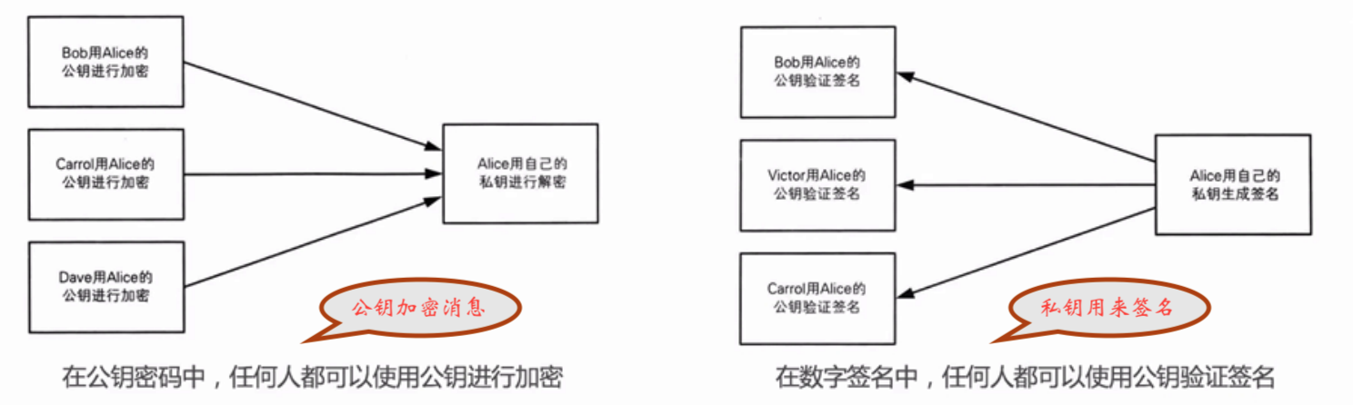 而签名则相反,签名需要消息发送者使用私钥进行加密生成签名,消息接收者收到签名之后,使用发送者的公钥进行解密。例如下面这张图: