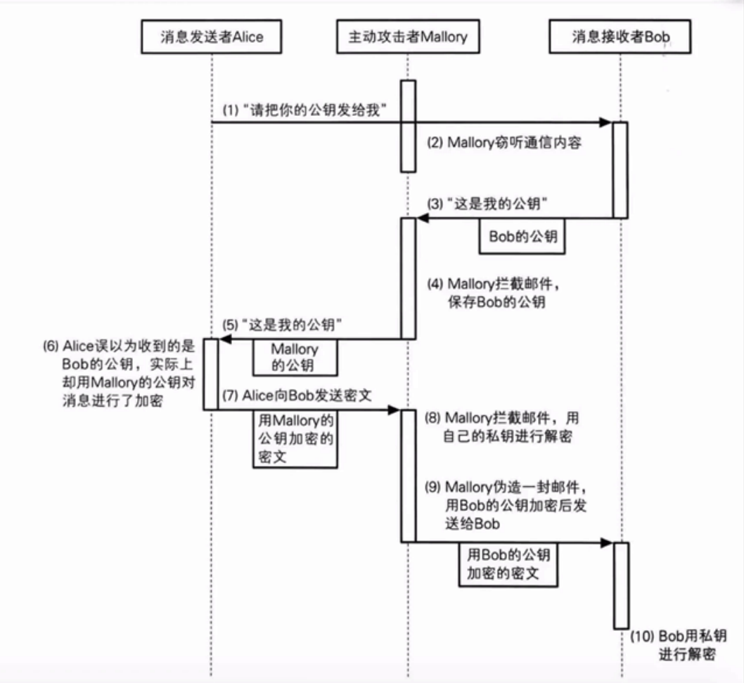 当 Alice 和 Bob 发送消息时,中间人 Mallory 监听两人的通讯,分别拦截对方的消息,向对方发送自己的公钥和签名。这样就可以随意监听和篡改消息内容。这就是中间人攻击。