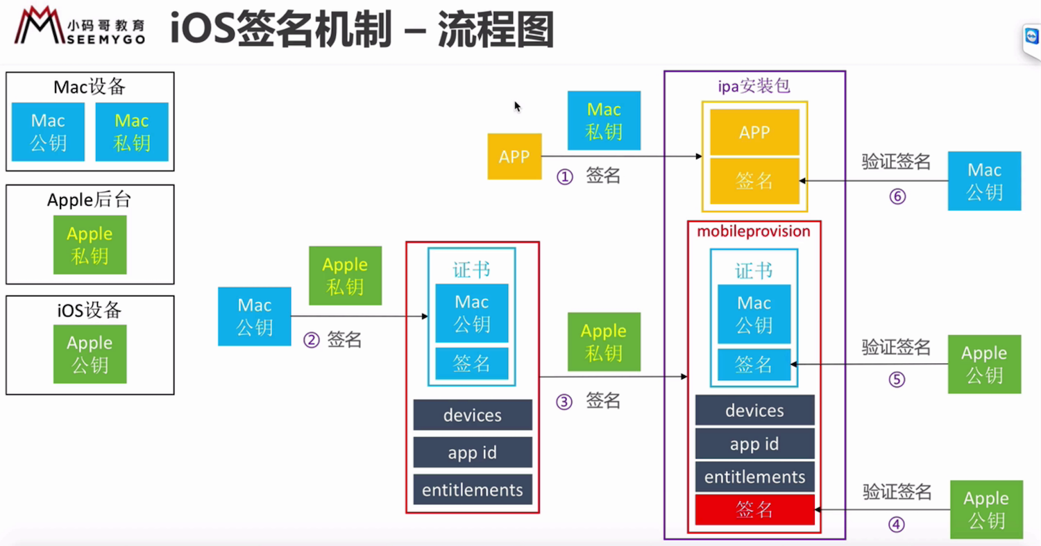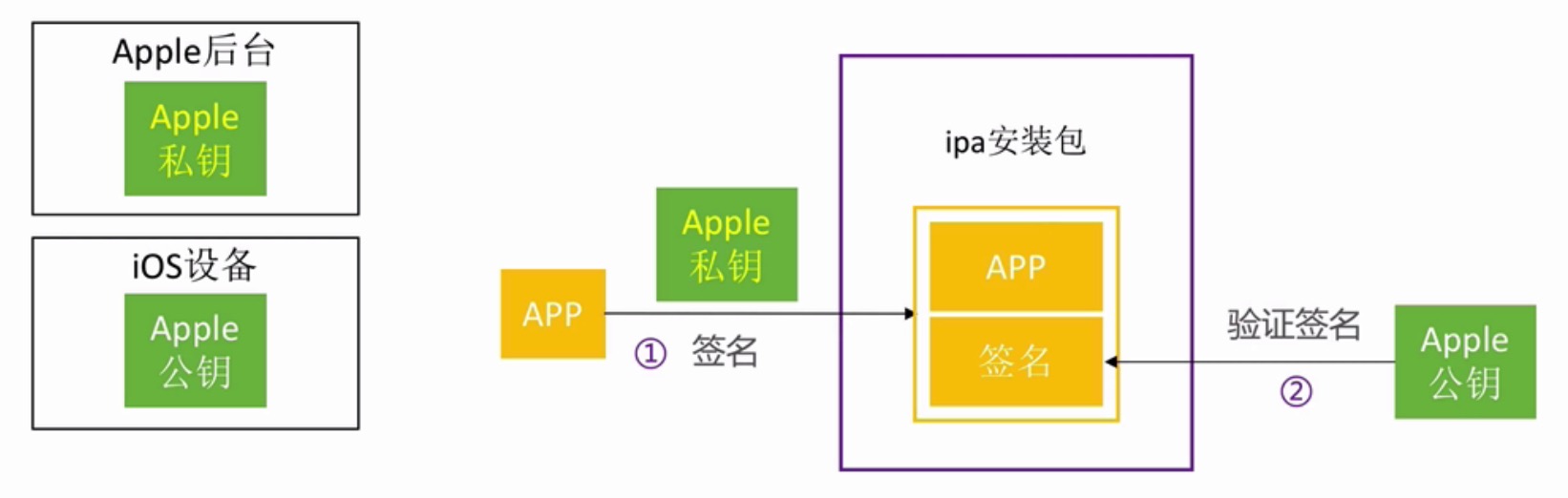 苹果的每台手机都有Apple的公钥,安装到手机上的包会使用苹果公钥进行验证。2