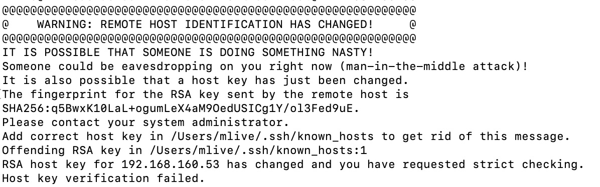 这是因为Mac电脑本地保存的服务端公钥和服务端本次发过来的公钥是不一致的,但是IP是一致的,SSH怀疑出现了中间人攻击的行为。出现这种情况时我们只要把本地保存的服务端公钥删除就可以了