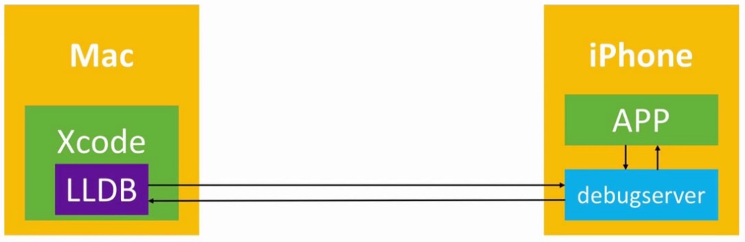 debugserver用来接收我们在 Xcode 敲出的 LLDB 指令,接收到指令后反馈给 APP,APP 执行指令后把结果反馈给debugserver,然后再由debugserver把结果返回给 LLDB ,再由 LLDB 把信息打印在 Xcode 上。过程如下图: