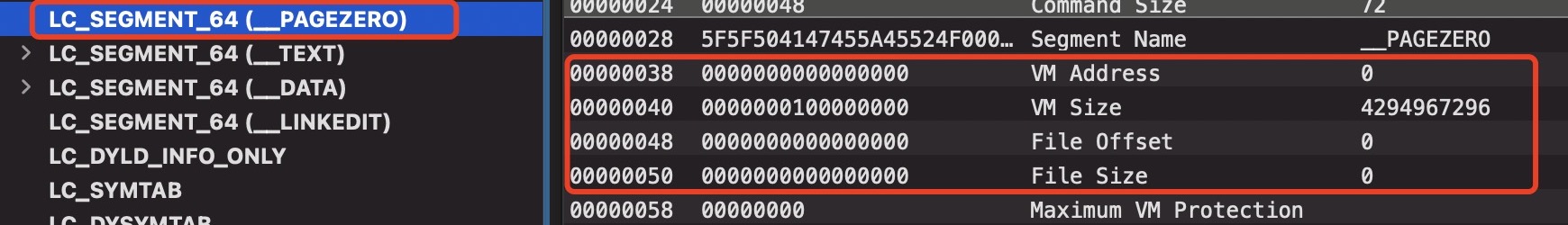 根据上图可以看出__PAGEZERO 段在虚拟内存时是有位置和大小的,而在Mach-O文件中是没有这个段的。在未使用ASLR技术的时候,Mach-O文件加载到内存中会增加__PAGEZERO 段。它的作用就是在obj = NULL时NULL指针,就是指向_PAGEZERO安全区域。