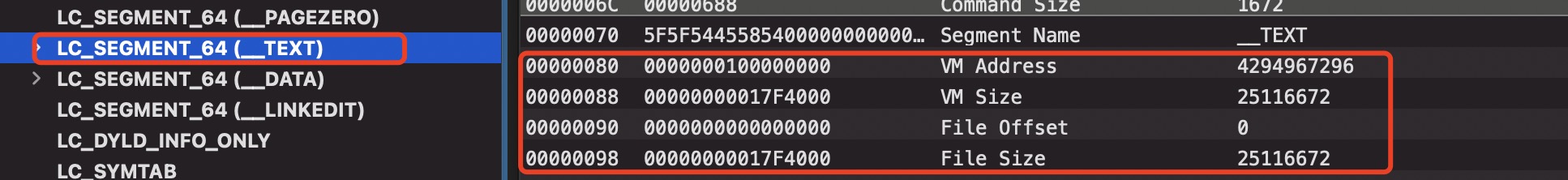 在arm64架构下,__PAGEZERO 段的大小是0x100000000,在armv7架构下大小是0X4000。我们也可以通过size -l -m -x mach-o文件查看nach-o文件的内存分布。