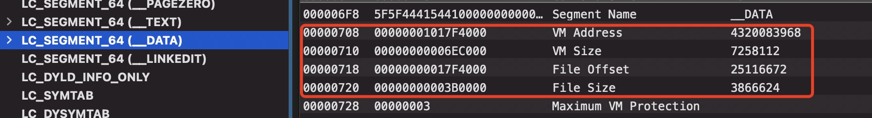 在Load commands中,我们需要知道这几个概念,虚拟内存地址(VM Address)、虚拟内存大小(VM Size)、在Mach-O文件中的位置(File Offset)、在Mach-O文件中的大小(File Size)。我们可以分别看下每个段的这几个值。