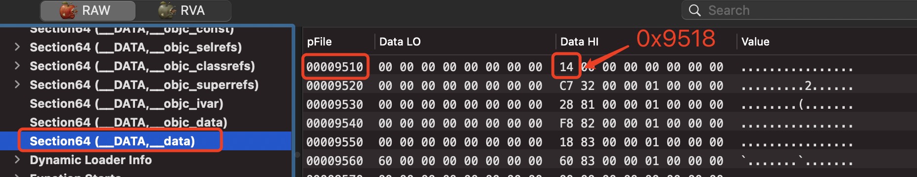 全局变量是在数据区,我们通过全局变量的地址减去ASLR偏移地址减去__PAGEZERO段虚拟中的内存地址就是它的地址。