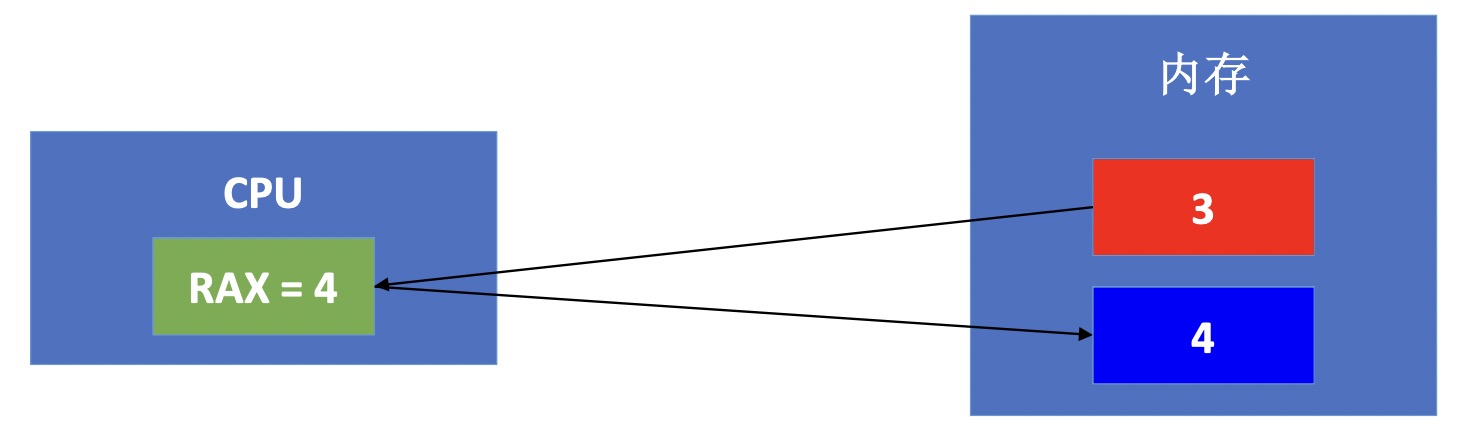 通常,CPU会先将内存中的数据存储到寄存器中,然后再对寄存器中的数据进行运算。假设内存中有块红色内存空间的值是3,现在想把它的值加1,并将结果存储到蓝色内存空间