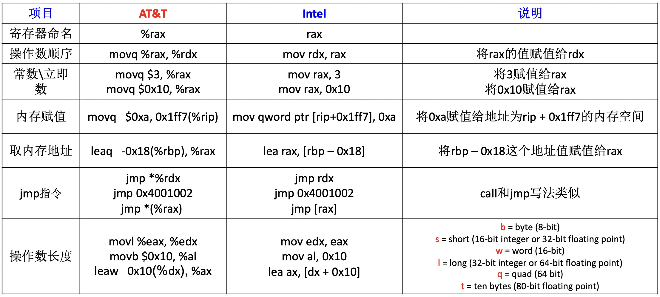 * `AT&T`mov指令是将左边的值赋值给右边、`Intel` mov指令是将右边的值赋值给左边