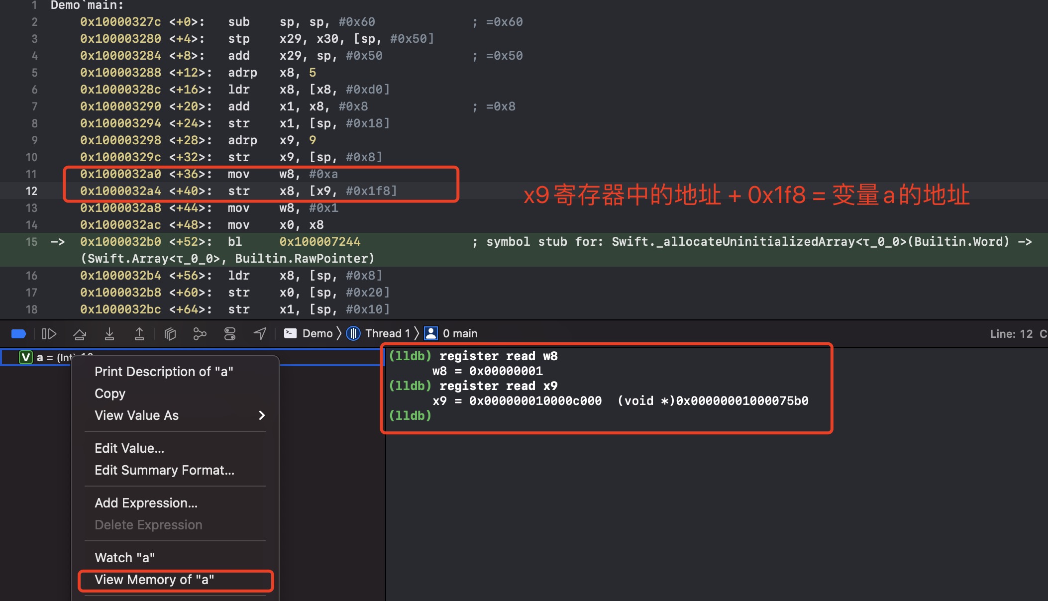 这是一个简单的赋值操作,使用的是M1芯片的Mac电脑。汇编语法可能会有差异,使用Debug -> Debug Workflow -> Always Show Disassembly查看汇编。使用LLDB指令读取出寄存器的值,根据汇编的含义加上偏移量等于a的地址值。通过查看地址看到确实有a存储在里面。