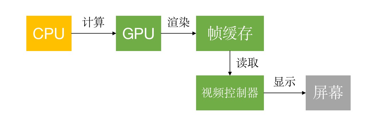 CPU主要负责计算,将计算好的数据交给GPU进行渲染,GPU将渲染好的数据存储在帧缓存中,视频控制器读取帧缓存中的数据,将读取的数据显示在屏幕上。在iOS中是双缓冲机制,有前帧缓存、后帧缓存。