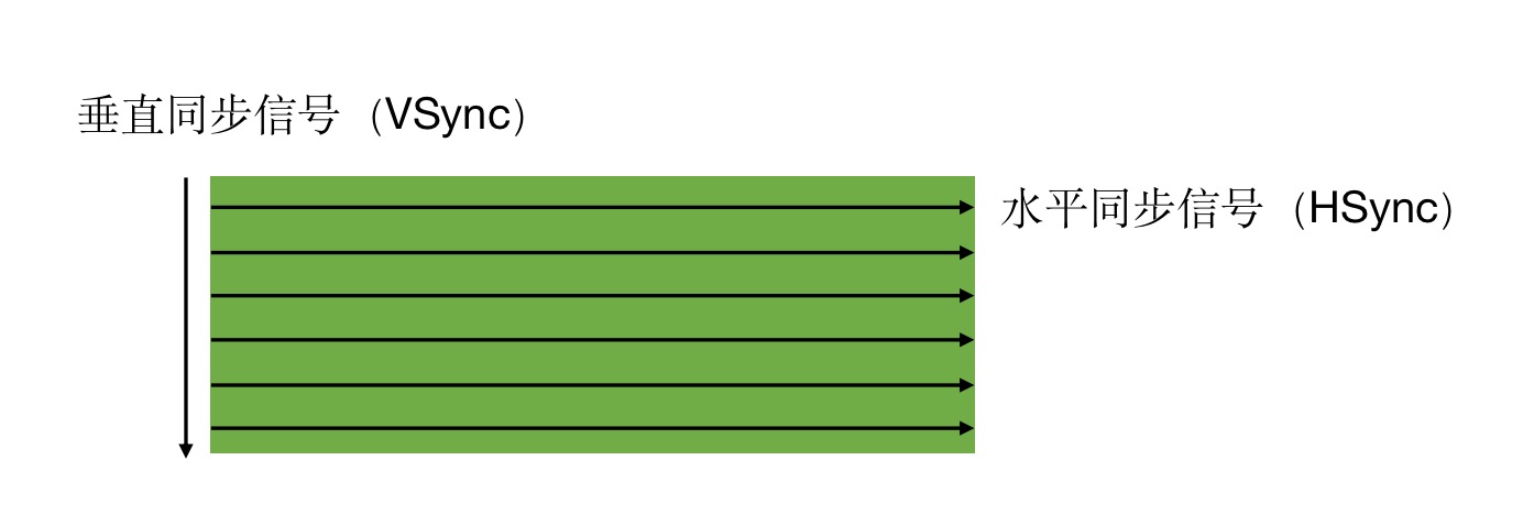 简单来说,就是产生一个垂直同步信号VSync,之后不断的进行水平同步信号HSync将屏幕显示完之后,再产生下一个VSync,再不断的进行水平同步信号HSync将整个屏幕显示完,重复这样的操作。每一个垂直同步信号就是一帧。