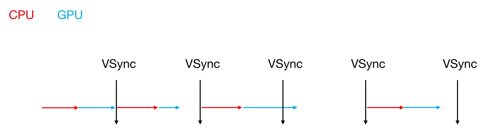 红色代表CPU,蓝色代表GPU,在第三个垂直同步信号到来的时候,CPU和GPU的计算还没有完成,就会造成当前帧延时显示的问题。俗称丢帧。
