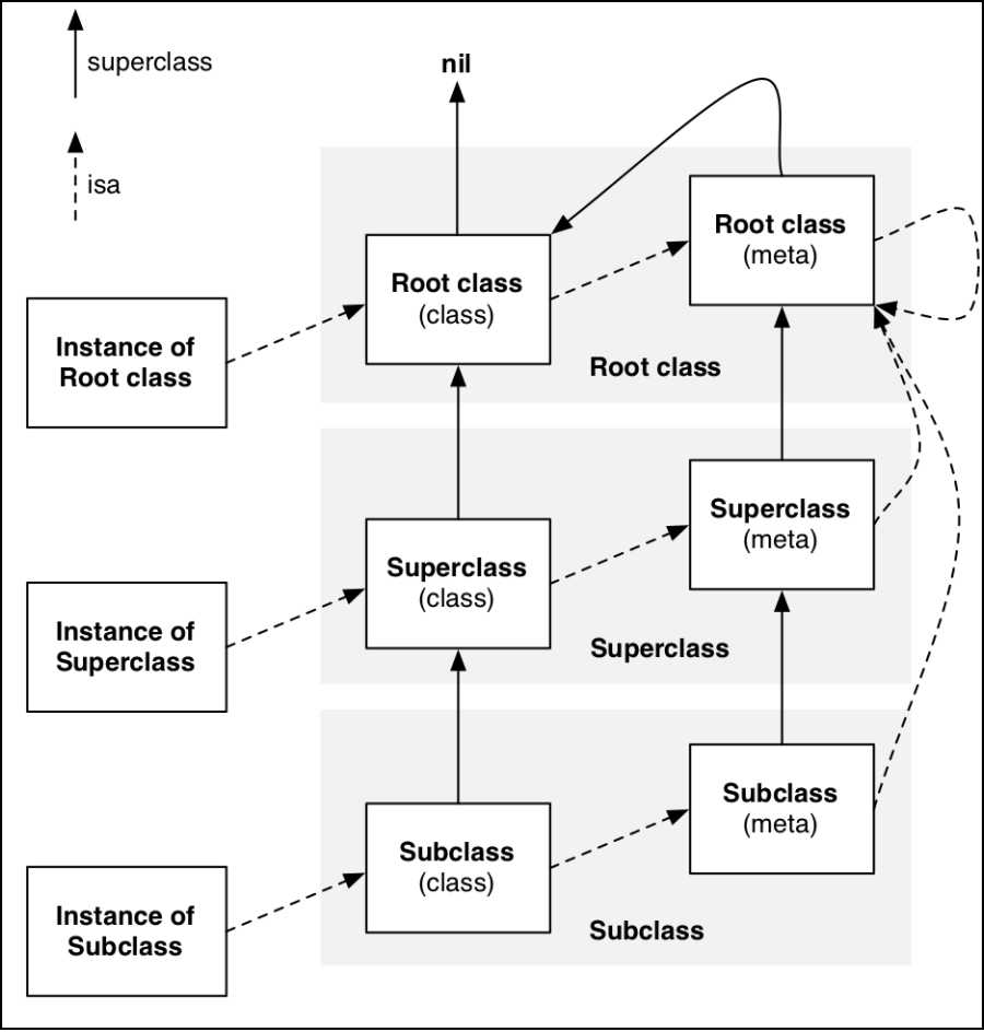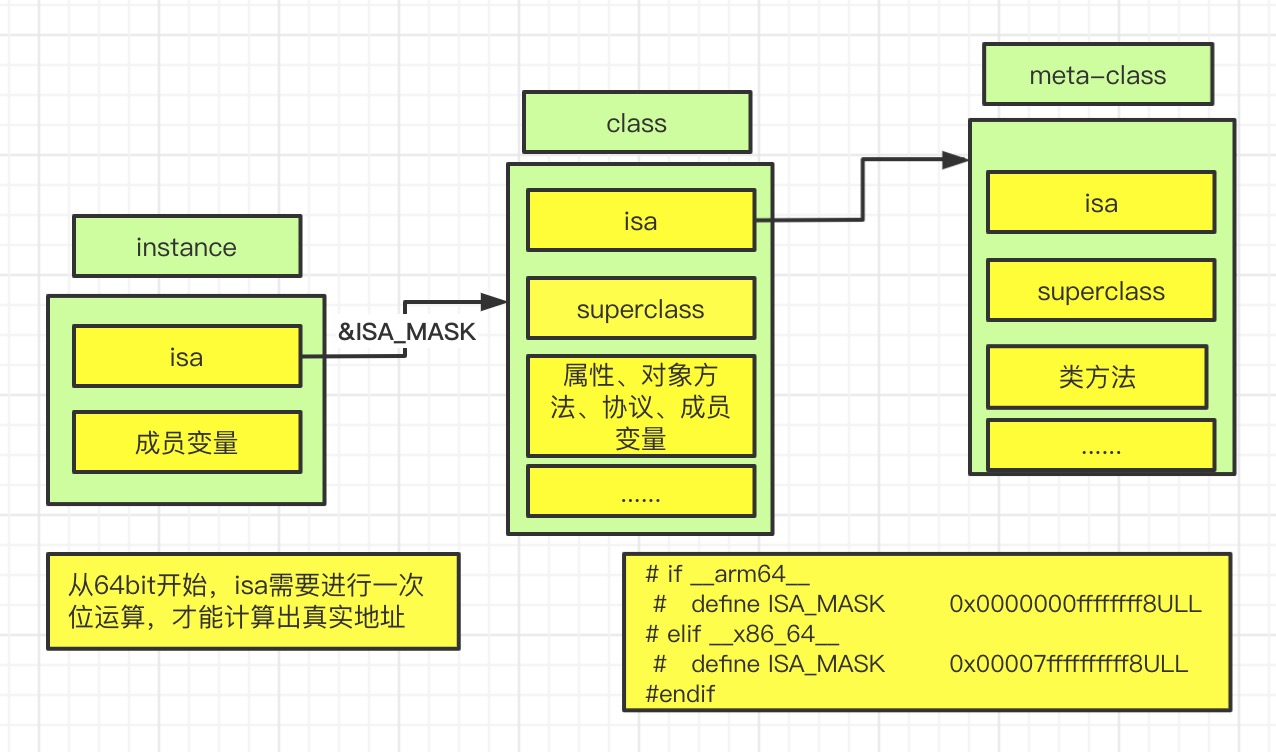 - instance的isa指向 class, class 的isa指向 meta-calss, meta-calss 的isa指向基类的meta-calss