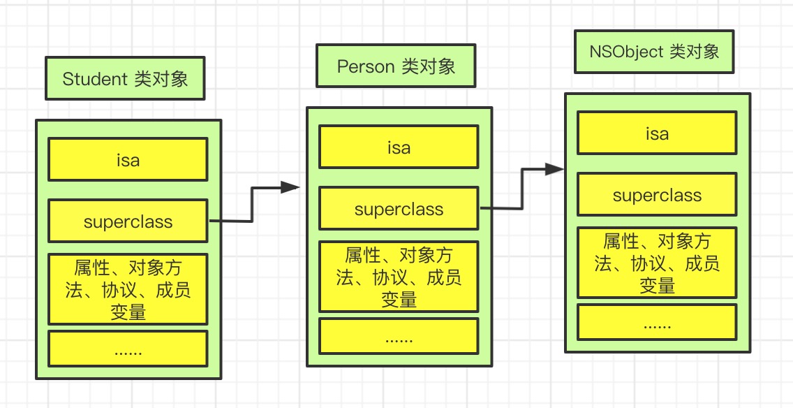 假设我们有一个 Person类 继承自 NSObject , 一个Student类继承自Person类,superclass指针的指向如下图所示。类对象的 superclass指针 指向的是 父类的类对象,当Student的实例对象调用父类的方法时,会先通过isa指针找到自己的类对象,再通过类对象的 superclass指针找到Person的类对象,然后找到对应的方法进行调用。