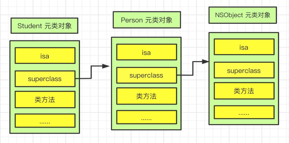 同上所述,**元类对象的superlcass指针 指向的是自己父类的元类对象。**当Student调用Person的类方法时,会先通过类对象的isa指针找到自己的元类对象,然后通过元类对象的 superclass指针 找到Person的元类对象进行调用。