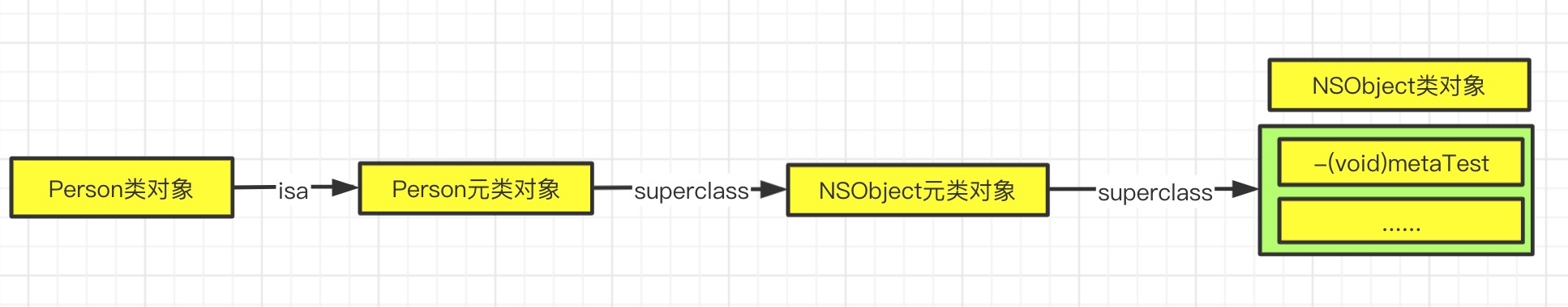 // Person 继承自 NSObject,同时添加了 metaTest类方法 ,但并没有对它实现。通过添加NSObject分类实现了- (void)metaTest{}方法。直接调用[Person metaTest]发现可以发现metaTest方法。