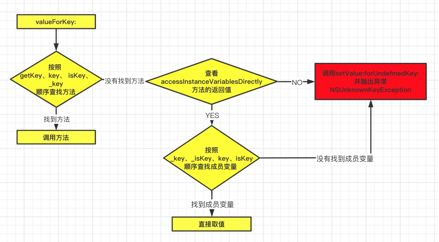 调用valueForKey:方法时,会优先按照getKey、key、isKey、_key的顺序查找方法,如果找到了直接调用。如果没找到,会查看accessInstanceVariablesDirectly方法的返回值是否允许访问成员变量,如果是NO,抛出NSUnknownKeyException异常。如果是 YES,会按照 _key、_isKey、key、isKey的顺序查找成员变量,如果有成员变量,直接获取成员变量的值,如果没有找到成员变量,则抛出NSUnknownKeyException异常。