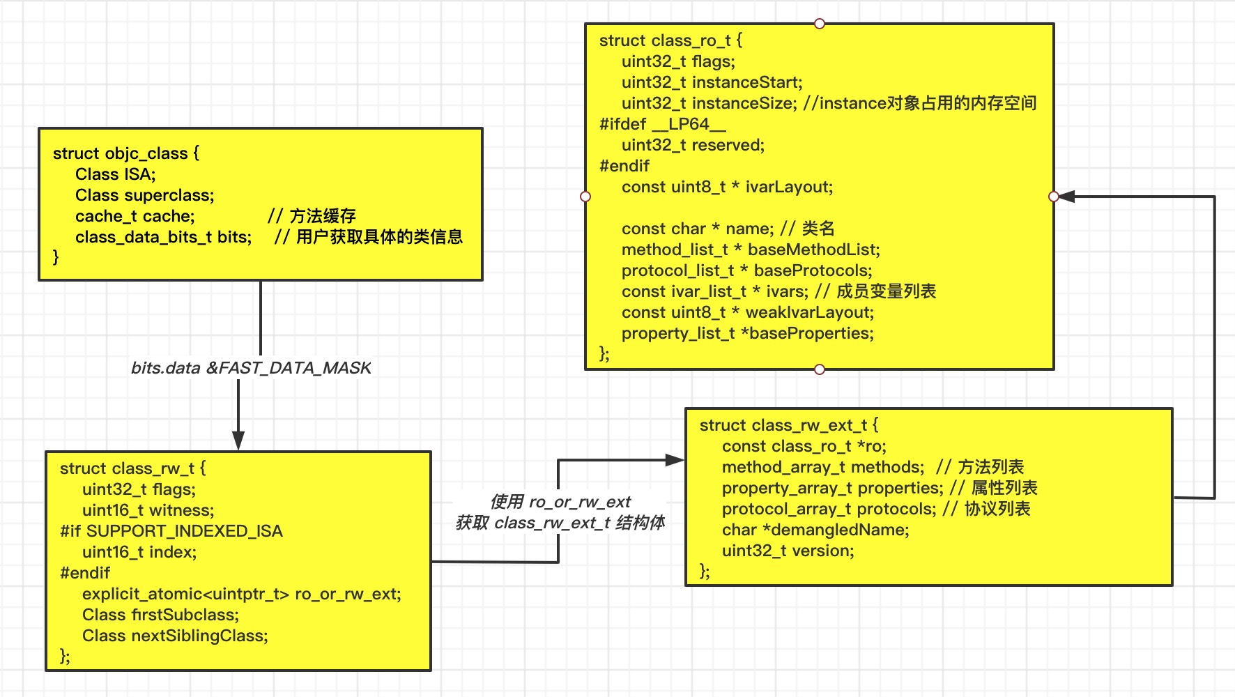 在isa和supperclass这篇文章中,我们粗略的讲过 Class 的结构,通过下面这张图重温一下 Class 的结构