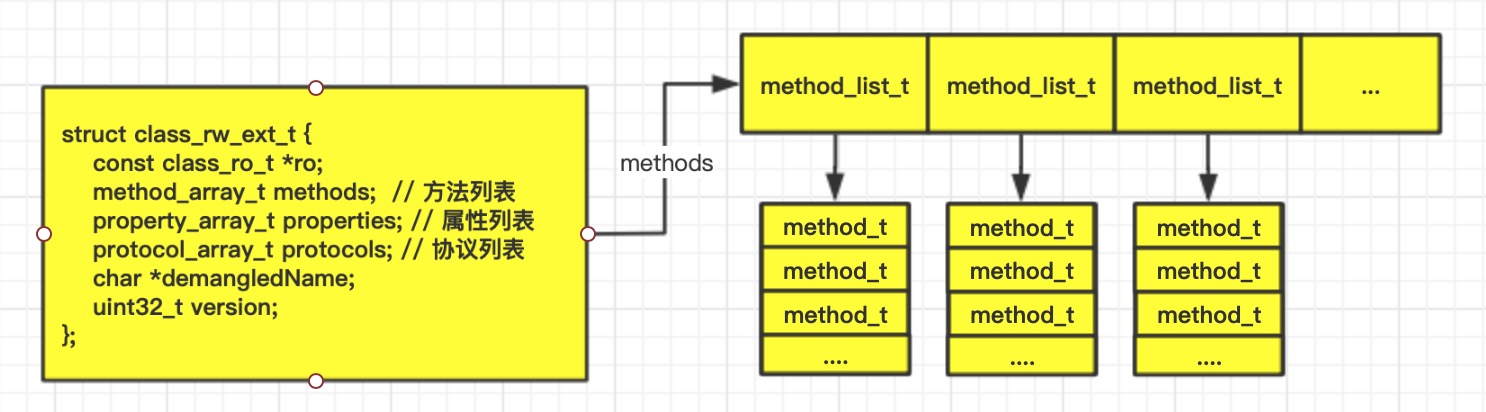 class_rw_ext_t结构体中的methods、properties、protocols是二维数组,是可读可写的,包含了类的初始内容、分类的内容。结构体如下图:
