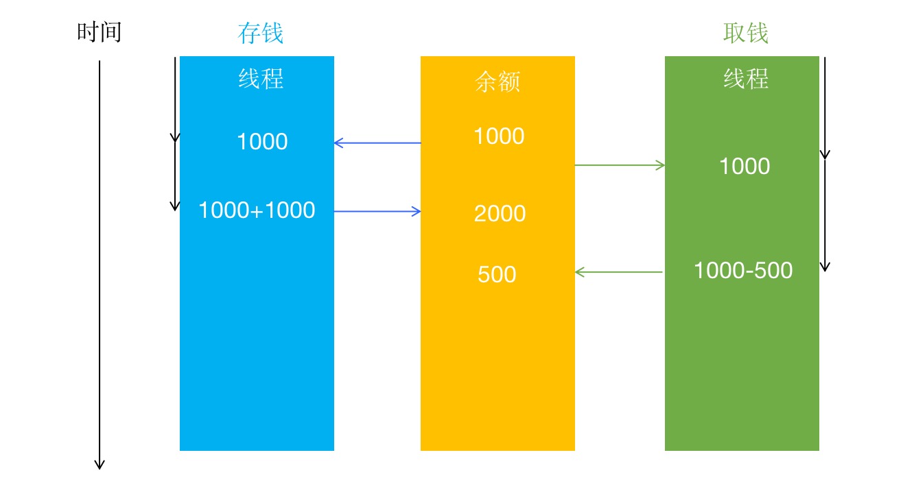 使用两个线程对银行存储的钱就行操作,一个存钱,一个取钱,当多个线程对同一个变量进行操作时,就会存在数据错乱的问题。使用图片进行表示,图片来源于小码哥的mj老师: