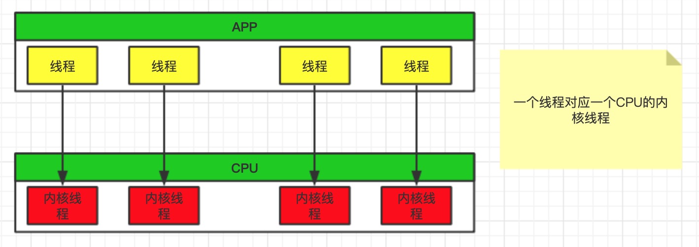 线程和CPU之间的关系,每个线程对应CPU中的一条内核线程,如下图: