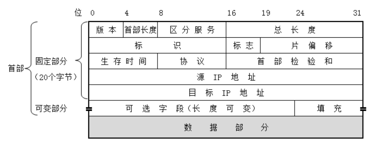 网络层首部由 固定部分(20个字节) 和 可变部分(最大40个字节) 组成,固定部分包含 IP协议版本、首部长度、区分服务、总长度、标识、标志、片偏移、生存时间(TTL)、协议、首部检验和、源IP地址、目标IP地址组成。我们将一一讲解首部的这些信息。