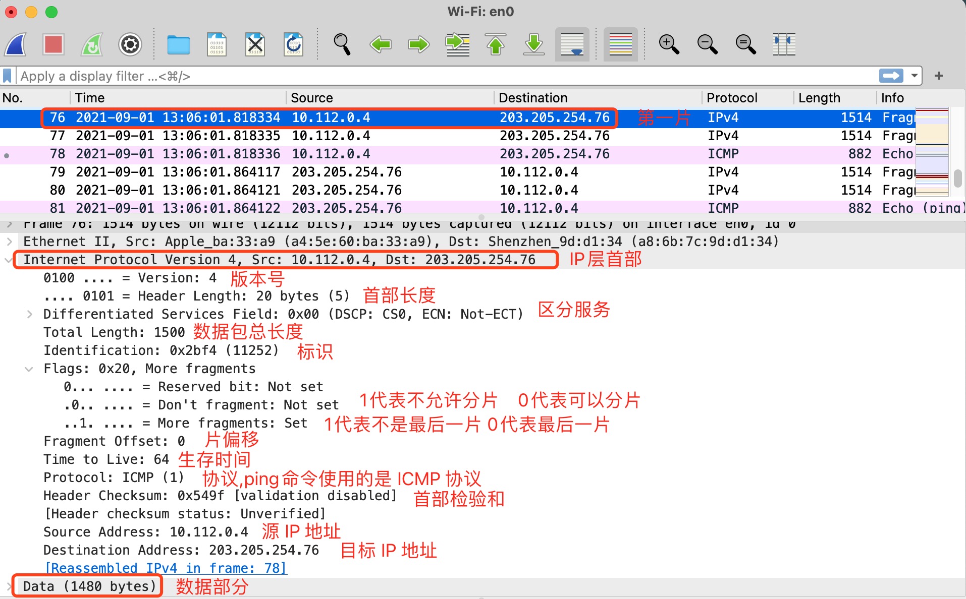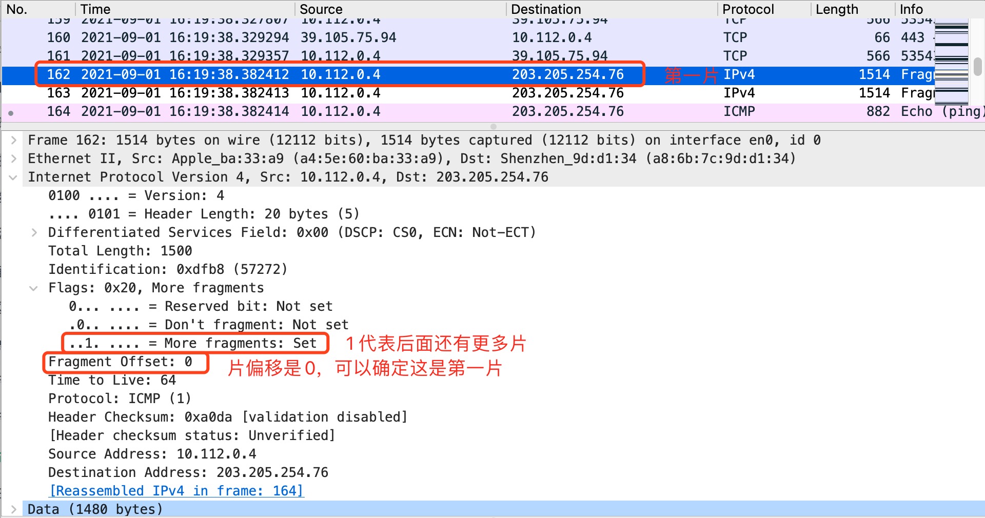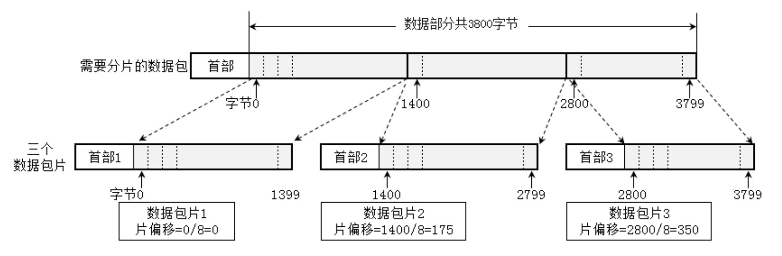 到第二片时,片偏移是1480,第一片一共1500个字节,减去首部20个字节,数据部分剩余1480字节,当接收端接收到数据时,就可以根据片偏移计算出这是一个 IP数据包的第几片。
