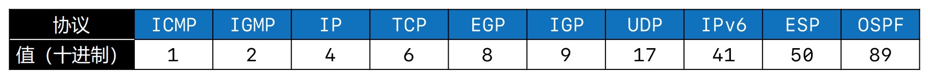 协议占8位,表明所封装的数据是使用了什么协议,每个协议对应的数值不同。具体值如下图: