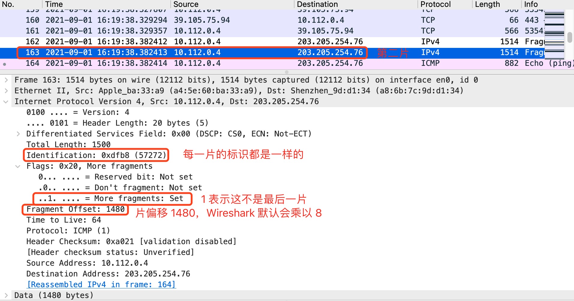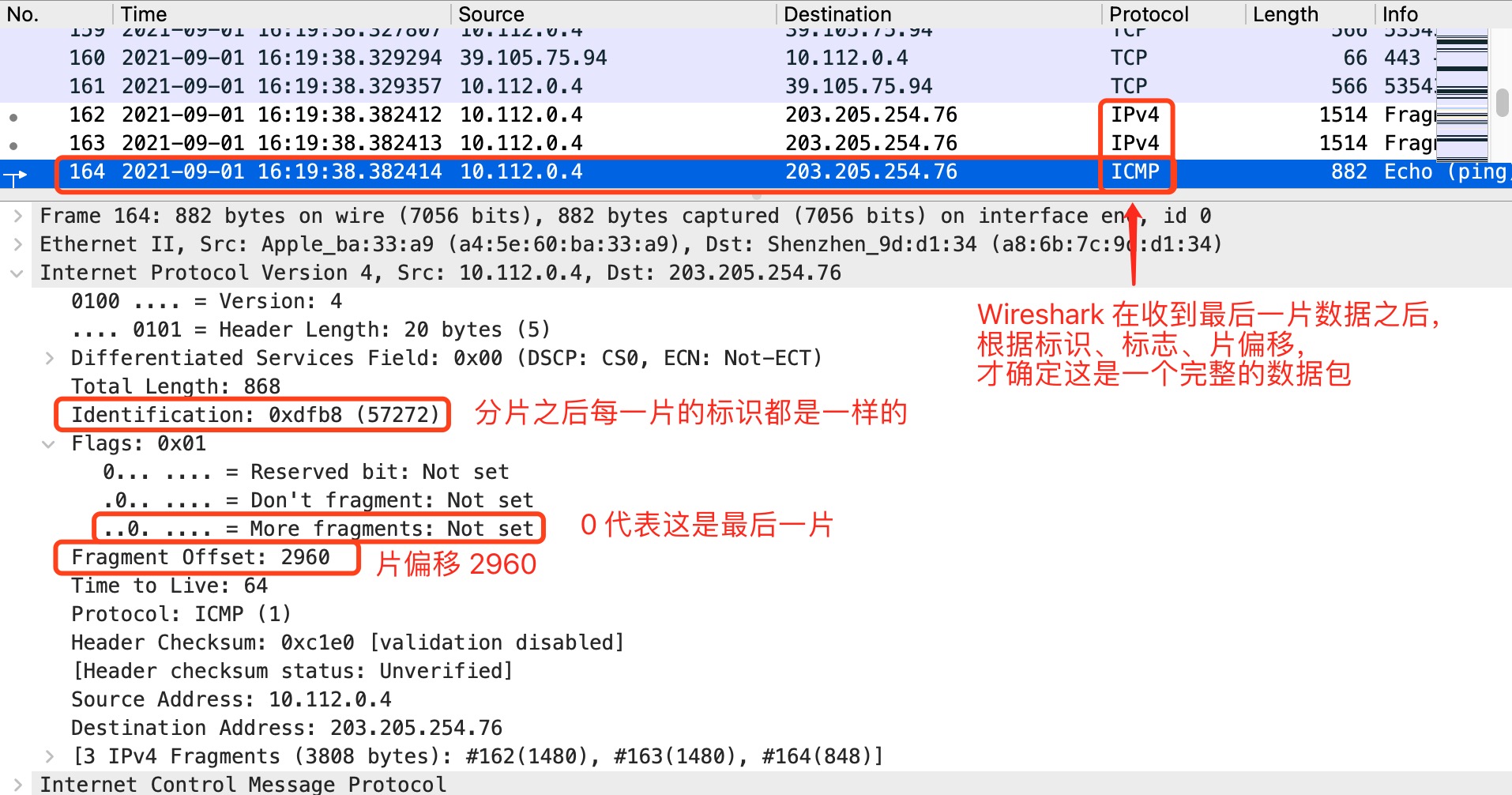 到第三片的时候,标志位More Fragments是0,表示这是最后一片, Wireshark 也是在最后一片的时候,才知道这三片是一个完整的数据包。
