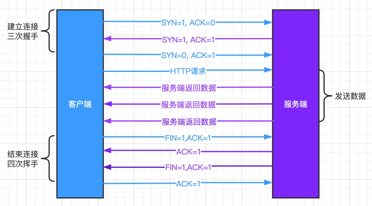 我们先通过下面这张图了解一个HTTP的请求过程,蓝色代表客户端,紫色表示服务端,箭头的颜色表示是客户端发送的数据还是服务端发送的数据: