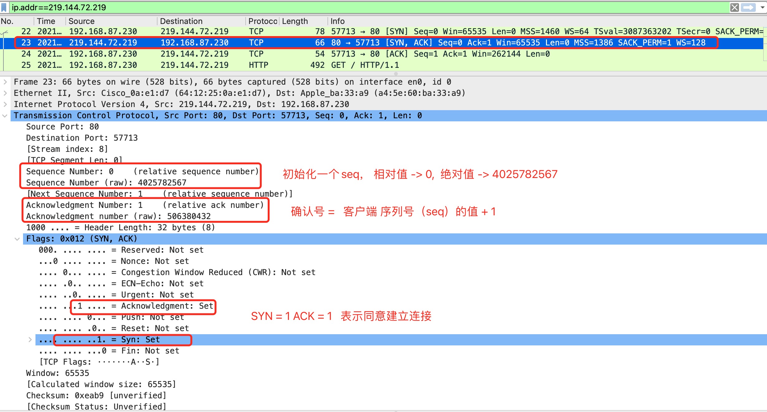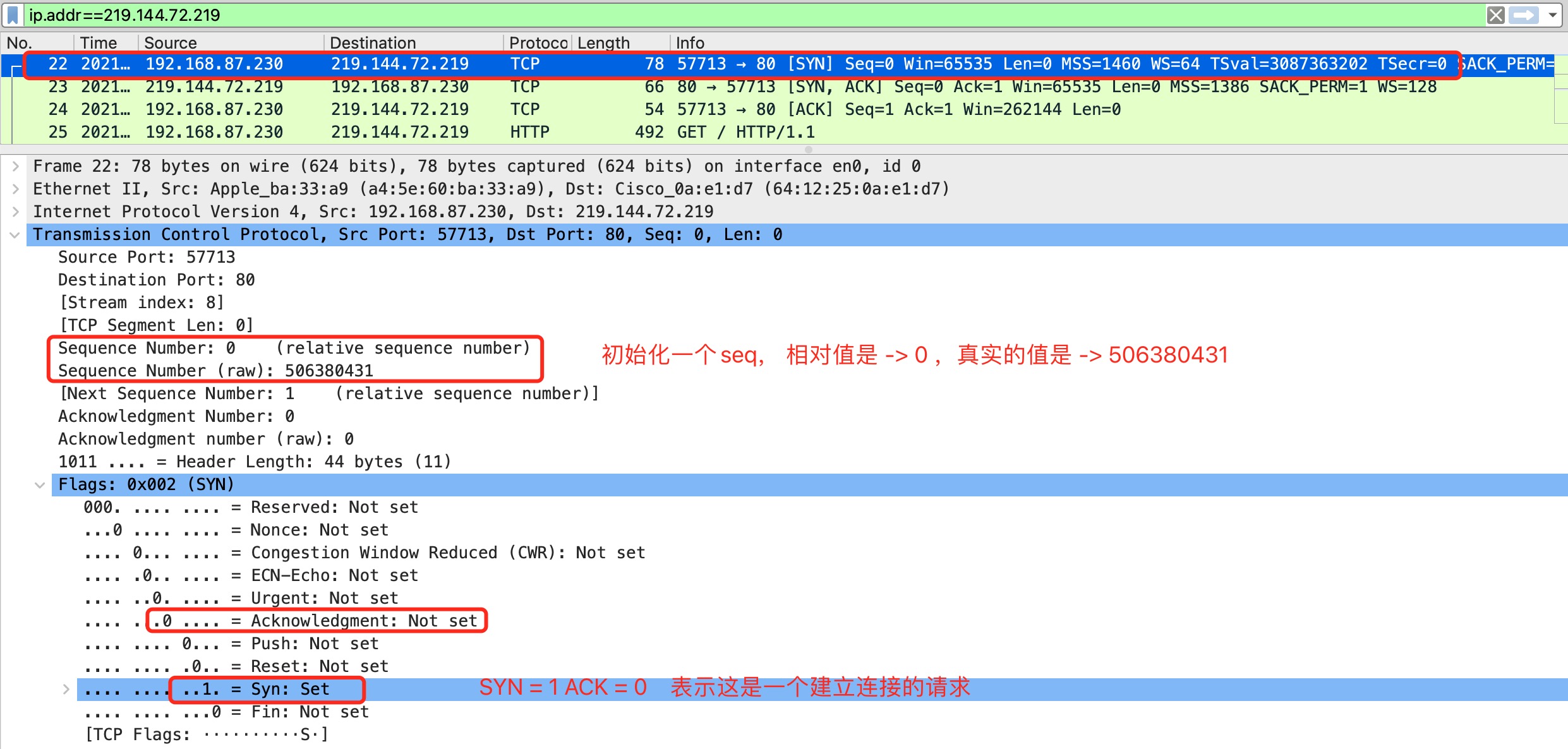 SYN=1、ACK=0, 表明这是一个建立连接的请求,并且初始化一个seq,(Wireshark 为了方便我们查看,会使用一个相对值 0,表明这是TCP连接的第一次请求)