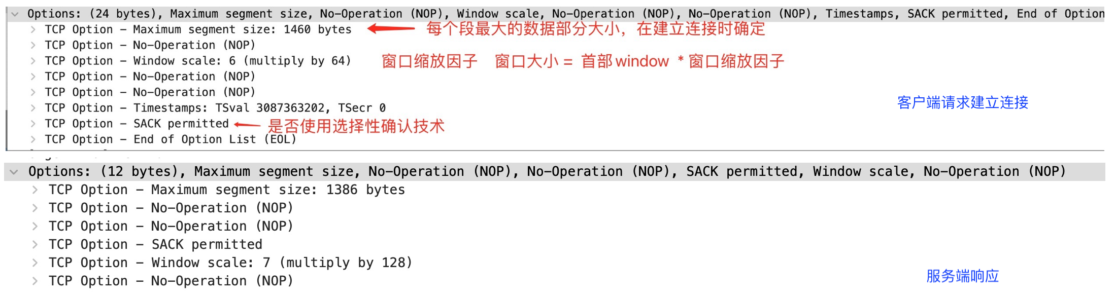我们知道TCP首部是20字节,可选部分是40字节,在第一次客户端请求建立连接时SYN = 1,ACK =0,可选部分为24字节,服务端同意建立连接SYN = 1,ACK =1,可选部分为12字节。如下图: