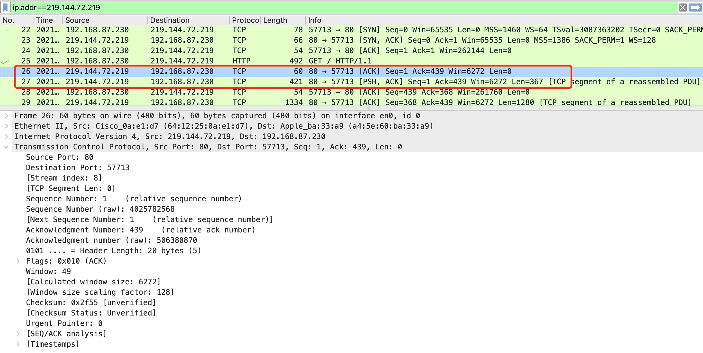 可以看到确实如我们介绍的一样,在进行HTTP请求之前,会进行三次握手。在三次握手中,客户端和服务端会交换一些信息,比如窗口大小、每个段的最大数据部分(MSS)、是否使用选择性确认技术(SACK),并且这三次是没有任何数据进行传输的。