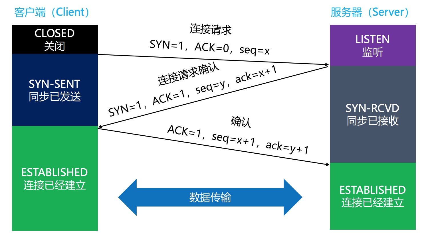 当客户端请求建立连接前,处于关闭状态,服务端处于监听状态,客户端发起建立连接的请求之后,处于SYN-SENT状态,服务端收到SYN报文之后,处于SYN-RCVD状态,客户端发送确认之后,双方处于连接已建立。