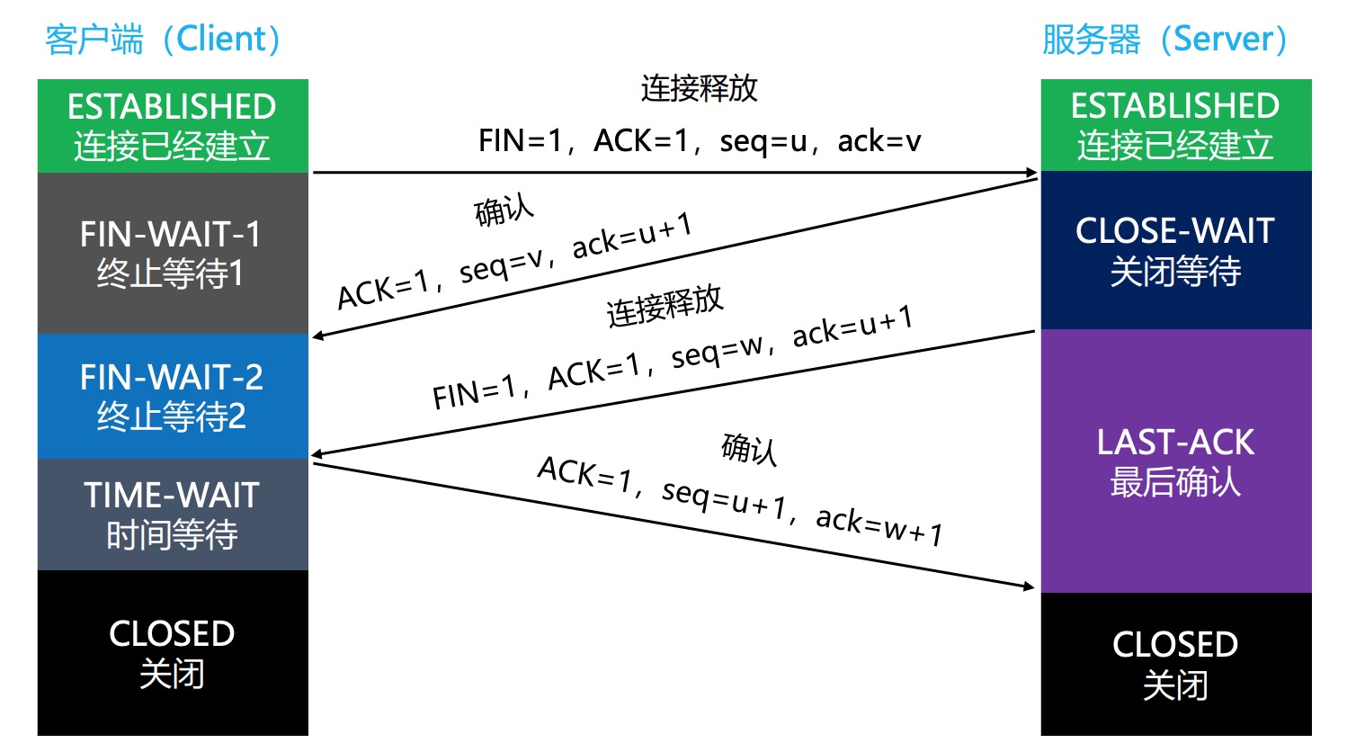 FIN-WAIT-1:表示想主动关闭连接,向对方发送了FIN报文,此时进入到 FIN-WAIT-1状态CLOSE-WAIT:表示在等待关闭,当对方发送FIN给自己,自己会回应一个ACK报文给对方,此时则进入到CLOSE-WAIT 状态。在此状态下,需要考虑自己是否还有数据要发送给对方,如果没有,发送FIN报文给对方FIN-WAIT-2:只要对方发送ACK确认后,主动方就会处于 FIN-WAIT-2 状态,然后等待对方发送FIN报文LAST-ACK:被动关闭一方在发送FIN报文后,最后等待对方的ACK报文。当收到ACK报文后,即可进入CLOSED状态了CLOSED:关闭状态CLOSING:一种比较罕见的例外状态- 表示你发送 FIN 报文后,并没有收到对方的 ACK 报文,反而却也收到了对方的 FIN 报文