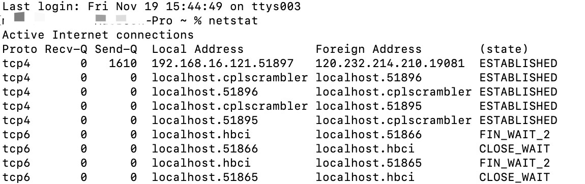 我们可以通过netstat命令查看当前设备跟其他主机的连接状态,由于有些状态的时间比较短暂,所以很难用netstat命令看到,比如SYN-RCVD、FIN-WAIT-1等
