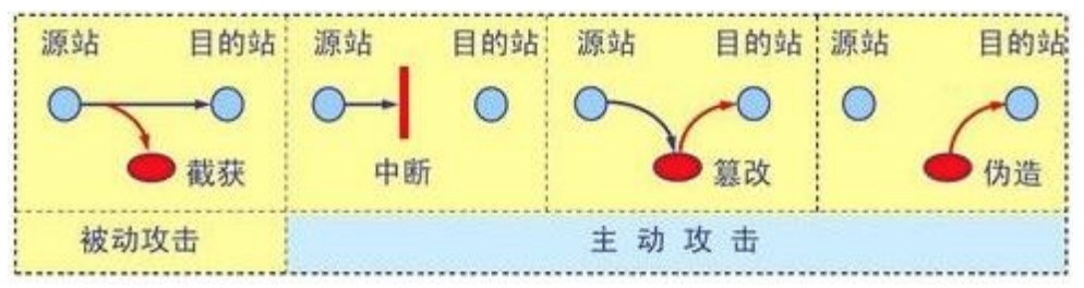 网络中面临的安全威胁可以分为4种: 截获:窃听通信内容、中断:中断网络通信、篡改:篡改通信内容、伪造:伪造通信内容。