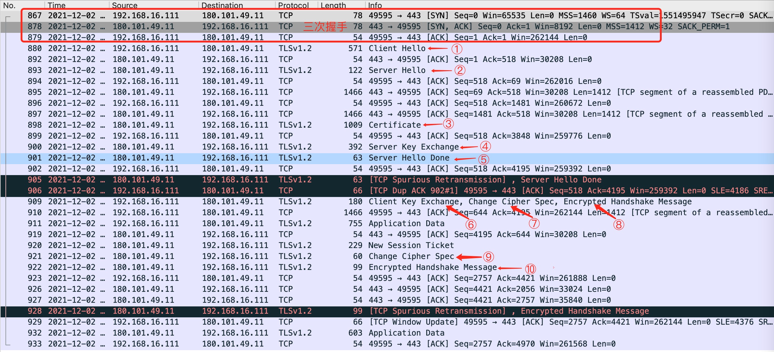 TLS 1.2 版本的连接过程大约有10步,主要是客户端和服务端双方沟通TLS的版本号,沟通双方通信加密方式以及验证CA证书。如下图: