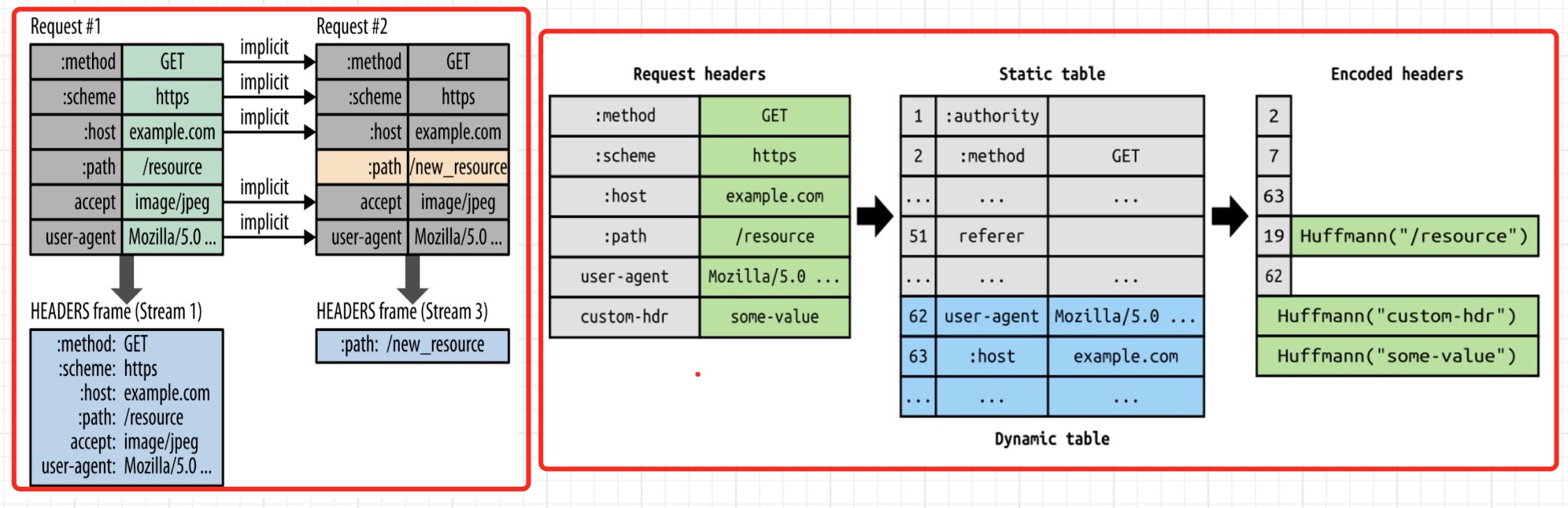 - 客户端与服务端根据RFC 7541的附录A,维护一份共同的静态字典(Static Table),其中包含了常见头部名及常见头部名称与值的组合的代码;
