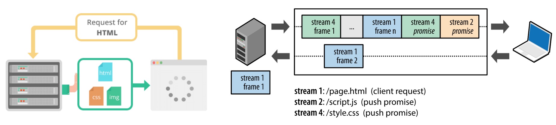 HTTP/2中,每个用户的操作行为被分配了一个流编号(Stream ID),这意味着用户与服务端之间创建了一个TCP通道;协议将每个请求分割为二进制的控制帧与数据帧部分,以便解析。