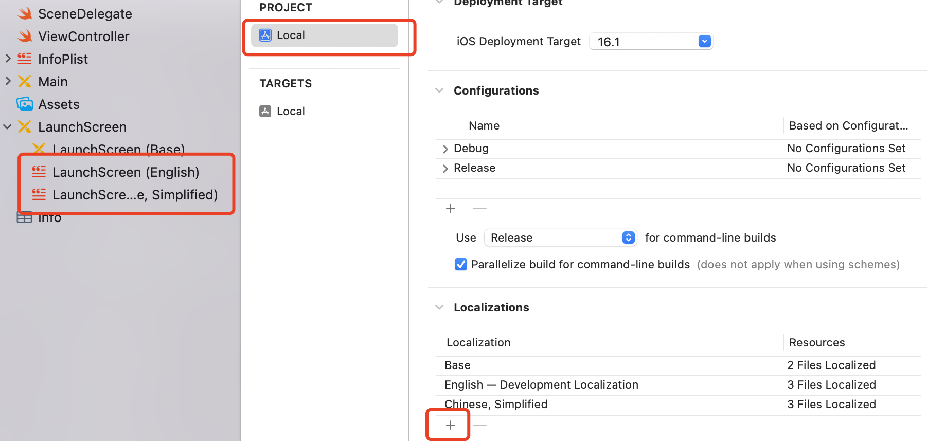 选择 Xcode -> PROJECT -> Localizations 添加其他语言