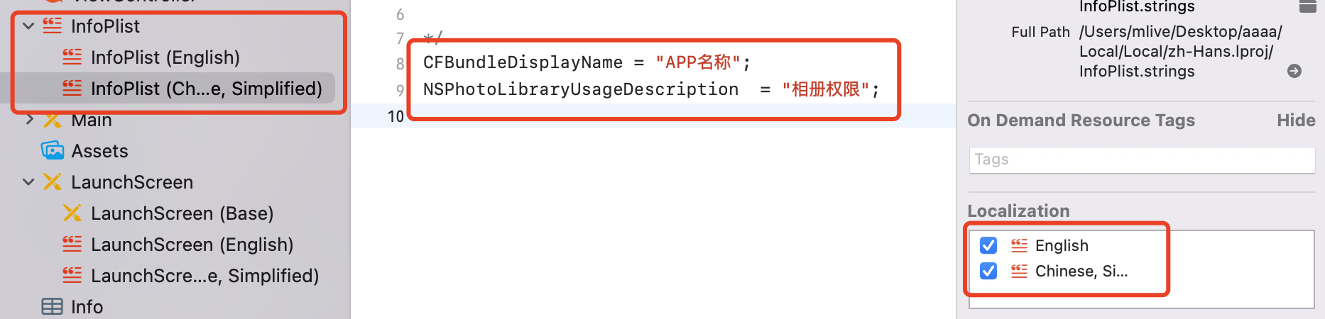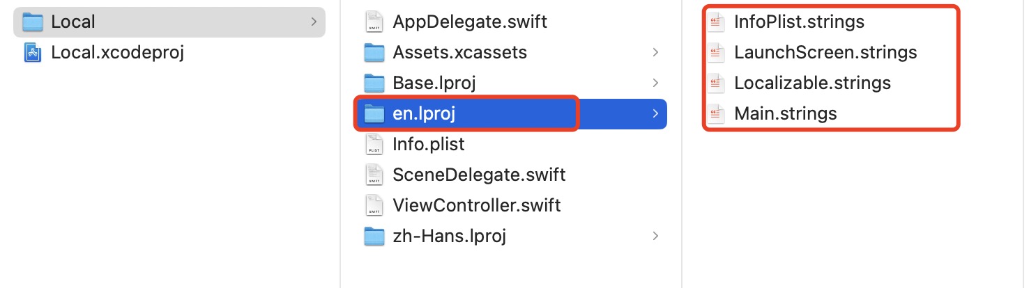项目每添加一种语言,Xcode会在根目录下创建对应的资源文件夹,对应的资源在文件夹内。比如zh-Hans.lproj文件夹。
