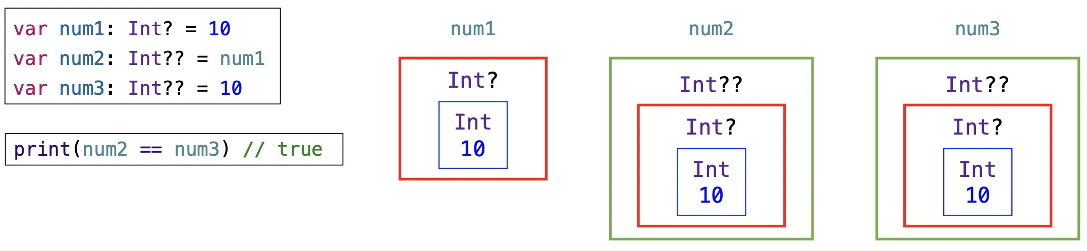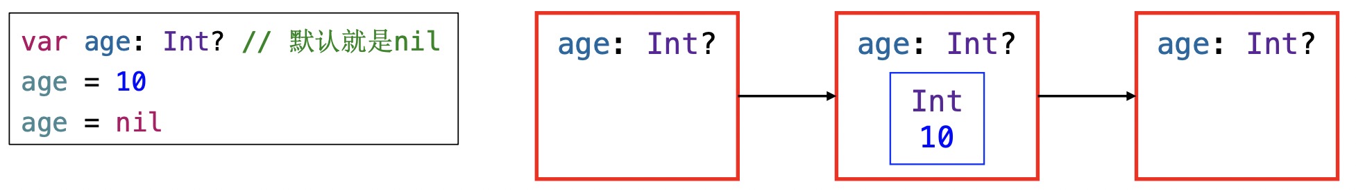 可选项是对其他类型的一层包装,可以将它理解为一个盒子,如果为nil,那么它是个空盒子。如果不为nil,那么盒子里装的是被包装类型的数据。如下图: