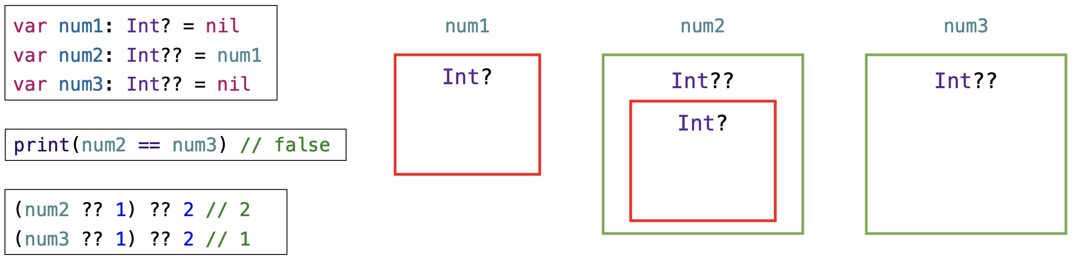 空合并运算符有以下几种情况,两个都是可选项,两个中只有一个可选项,如下面的代码: