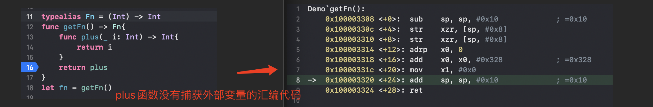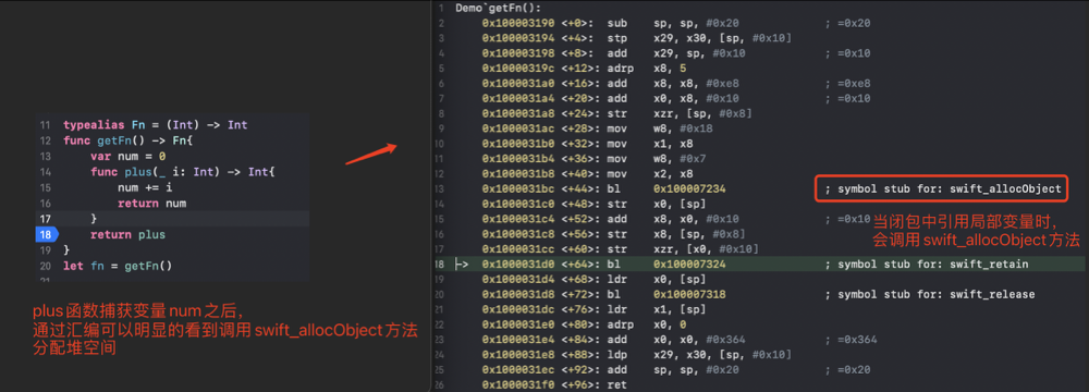 第二段代码,在嵌套函数内部捕获栈空间的局部变量,看汇编时明显看到swift_allocObject分配内存空间。