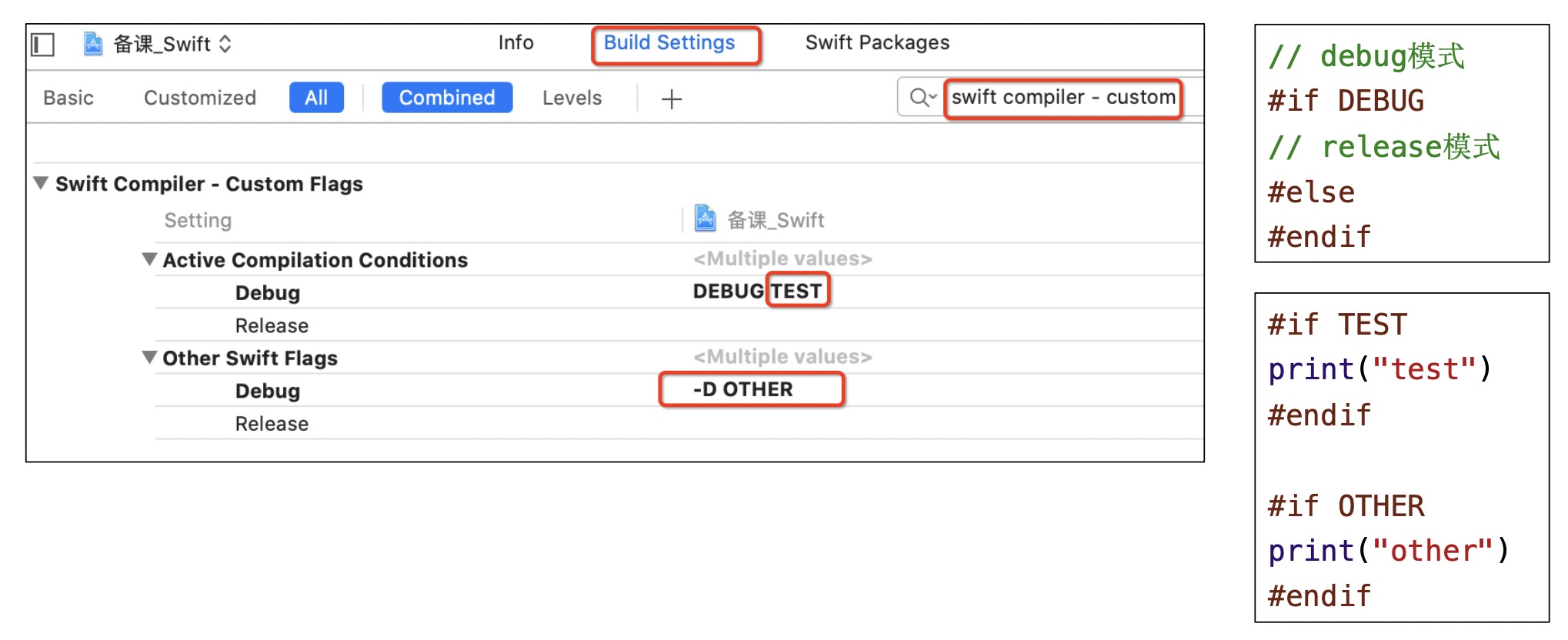 添加自定义的条件编译宏,选择TARGETS -> Build Settings ->swift compiler - Custom Flags。