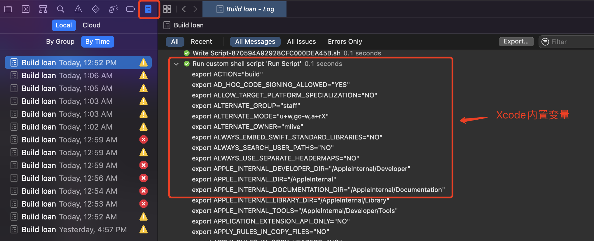 ${BUILD_DIR} | build文件的路径 | /Users/mlive/Library/Developer/Xcode/DerivedData/loan-dmnqkzmjvvadlyamxlyhxztvlhsp/Build/Products |